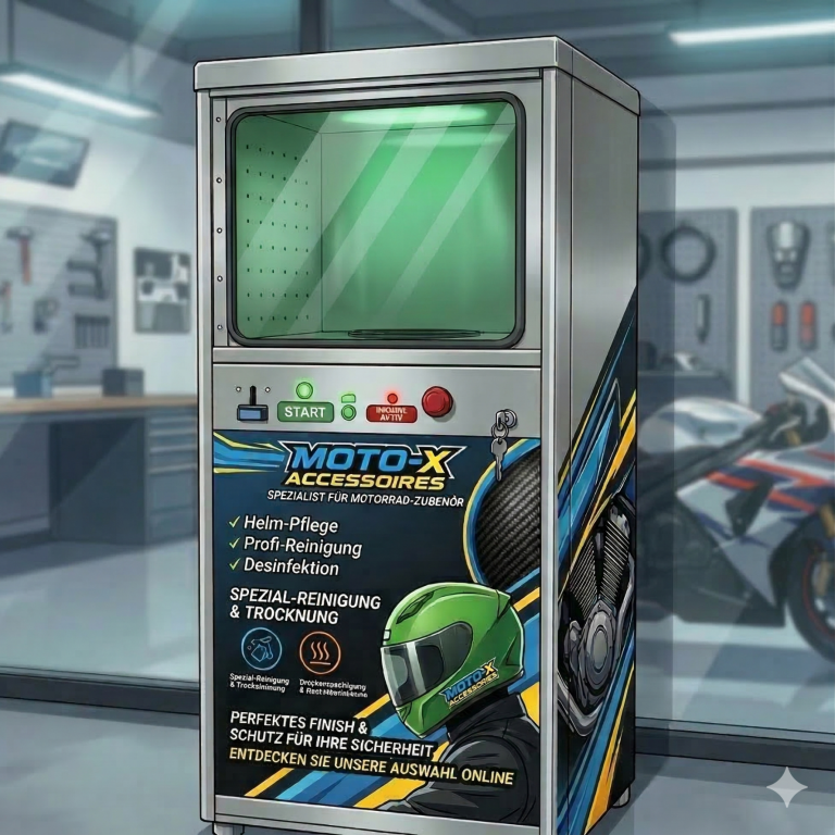 Veynding bietet innovative Automaten, die Motorradhelme effizient durch Desinfektionsnebel reinigen – hygienisch, kontaktlos und in wenigen Minuten wieder fahrbereit.