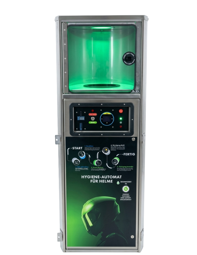 Im Helminneren sammeln sich mit der Zeit Schweiß, Gerüche und Bakterien. Der Automat verteilt Desinfektionsnebel im gesamten Helm, der Bakterien reduziert und für hygienische Frische sorgt.
